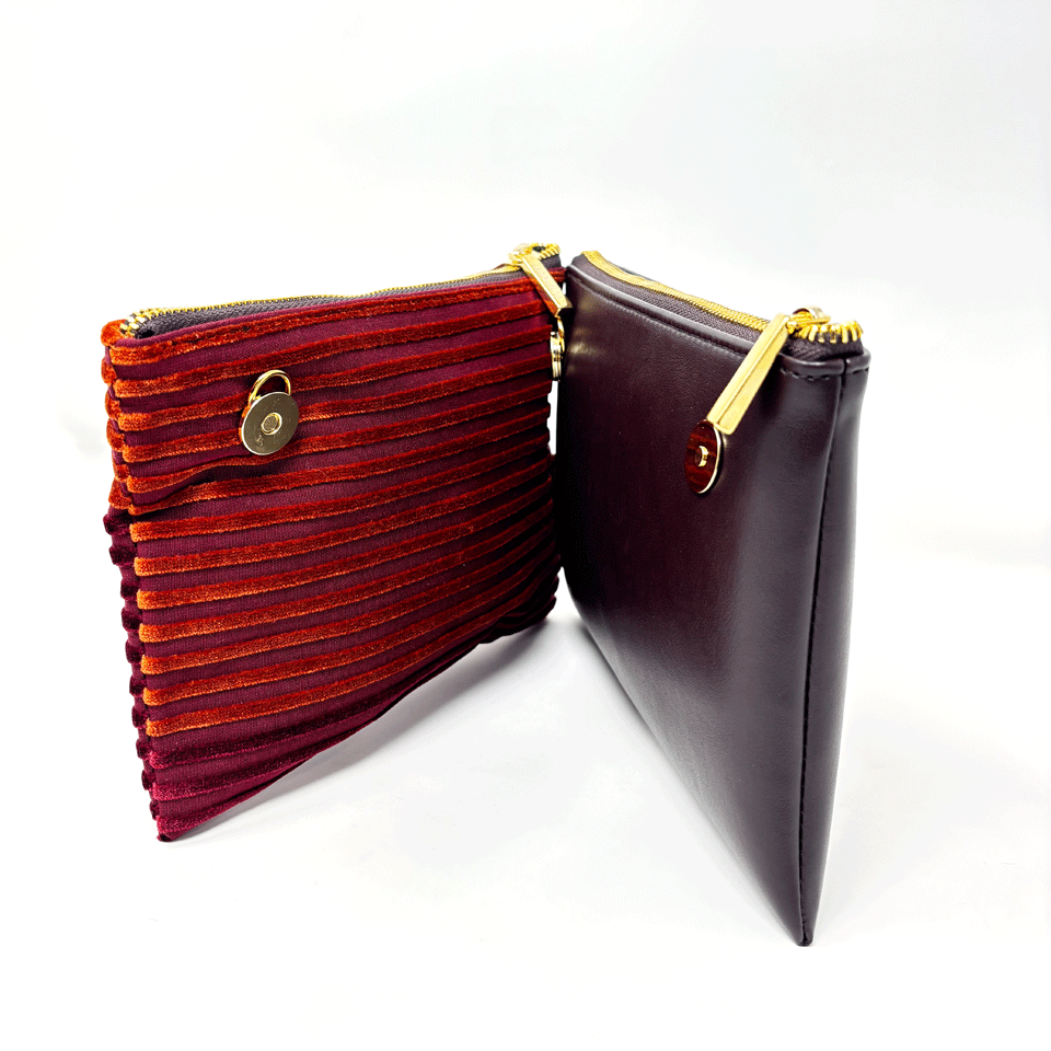 La borsa pezzo unico che combina fantasia con eleganza. Perfetta di giorno ma anche di sera! Mini pochette in eco pelle e tessuto costituita da due bustine staccabili e utilizzabili singolarmente come porta monete. Una busta realizzata in eco pelle proveniente dagli estratti di mela e l'altra in tessuto. Tracolla in eco pelle che si può staccare lunghezza tracolla 1,16 mtl.  Dimensioni: 20x15