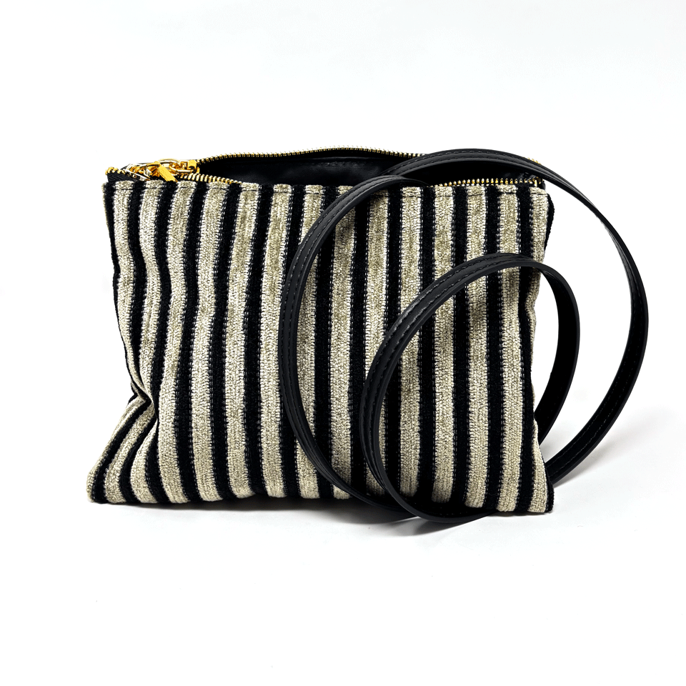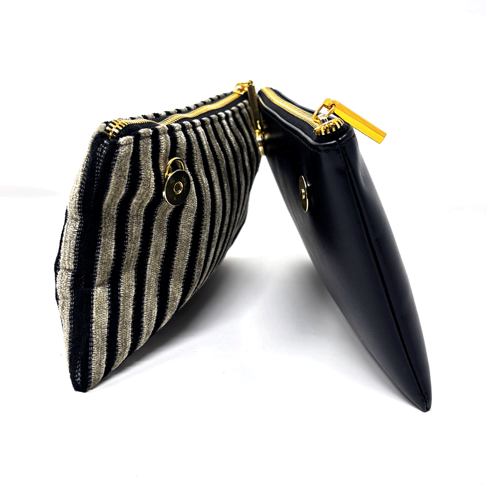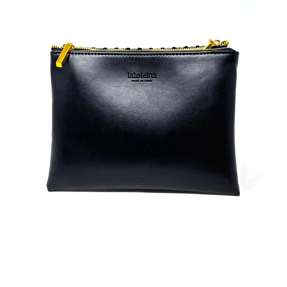 La borsa pezzo unico che combina fantasia con eleganza. Perfetta di giorno ma anche di sera! Mini pochette in eco pelle colore nera e tessuto costituita da due bustine staccabili e utilizzabili singolarmente come porta monete. Una busta realizzata in eco pelle proveniente dagli estratti di mela e l'altra in tessuto. Tracolla in eco pelle che si può staccare lunghezza tracolla 1,16 mtl.  Dimensioni: 20x15