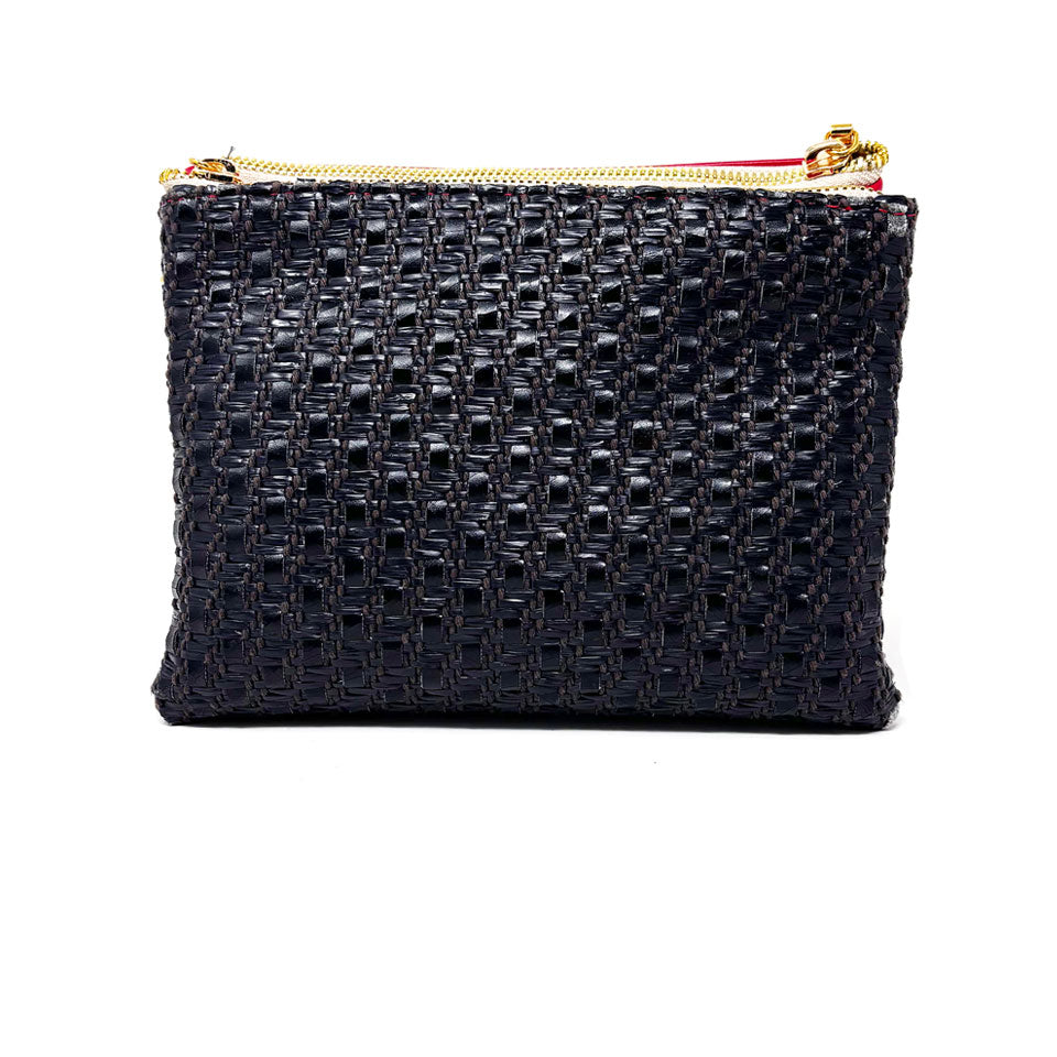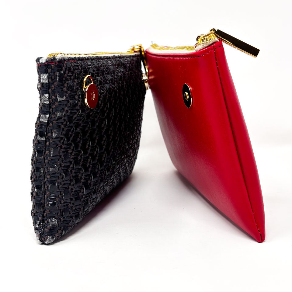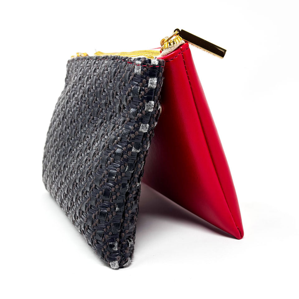 La borsa pezzo unico che combina fantasia con eleganza. Perfetta di giorno ma anche di sera! Mini pochette in eco pelle colore rosso e tessuto intrecciato nero costituita da due bustine staccabili e utilizzabili singolarmente come porta monete. Una busta realizzata in eco pelle proveniente dagli estratti di mela e l'altra in velluto una volta utilizzato per arredare hotels di lusso. Tracolla in eco pelle che si può staccare lunghezza tracolla 1,16 mtl.  Dimensioni: 20x15