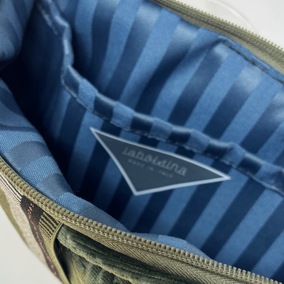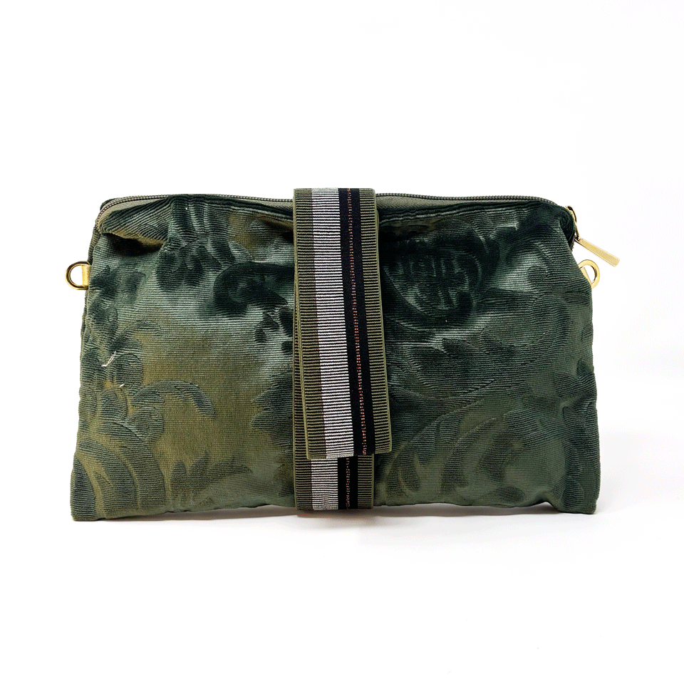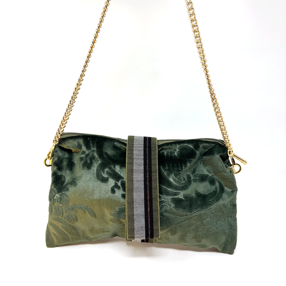 Pochette limited edition, realizzata con un velluto colore verde , utilizzato una volta per arredare hotels di lusso. Inserto di banda elastica che permette di indossare la pochette al polso. Fodera in tessuto colore blu Catena in oro lunghezza di 69 cm Dimensione unica: 30x17, chiusura con zip